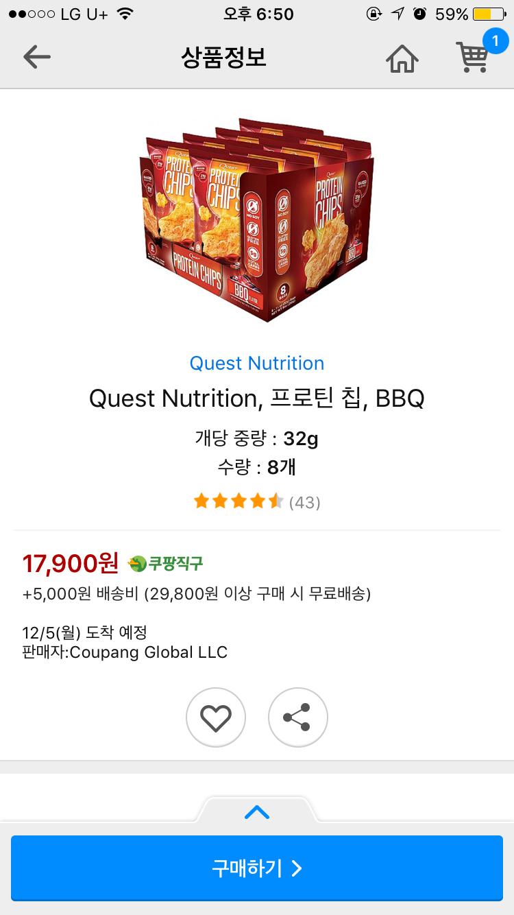 [쿠팡] 퀘스트 프로틴칩 BBQ맛 8봉 (17,900원 / 5,000원) > 이건어때