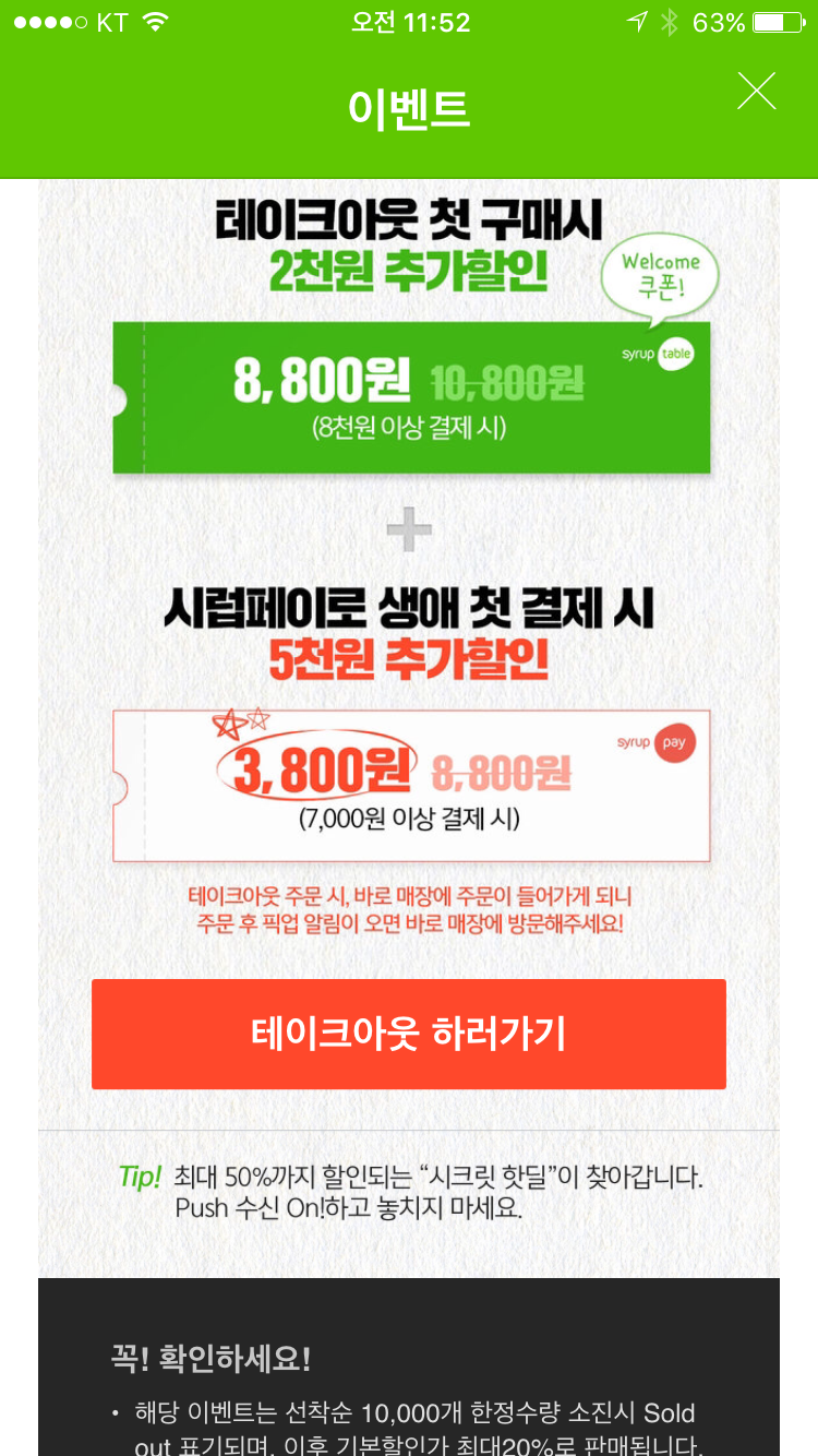 테이크 아웃 첫구매 or 시럽페이 첫 결제 시 더 싸져요!