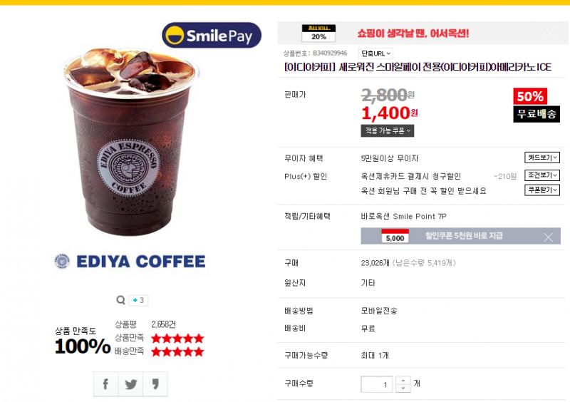 [옥션] 이디야커피 ICE아메리카노 SmilePay 전용 (1,400/무료) > 이건어때