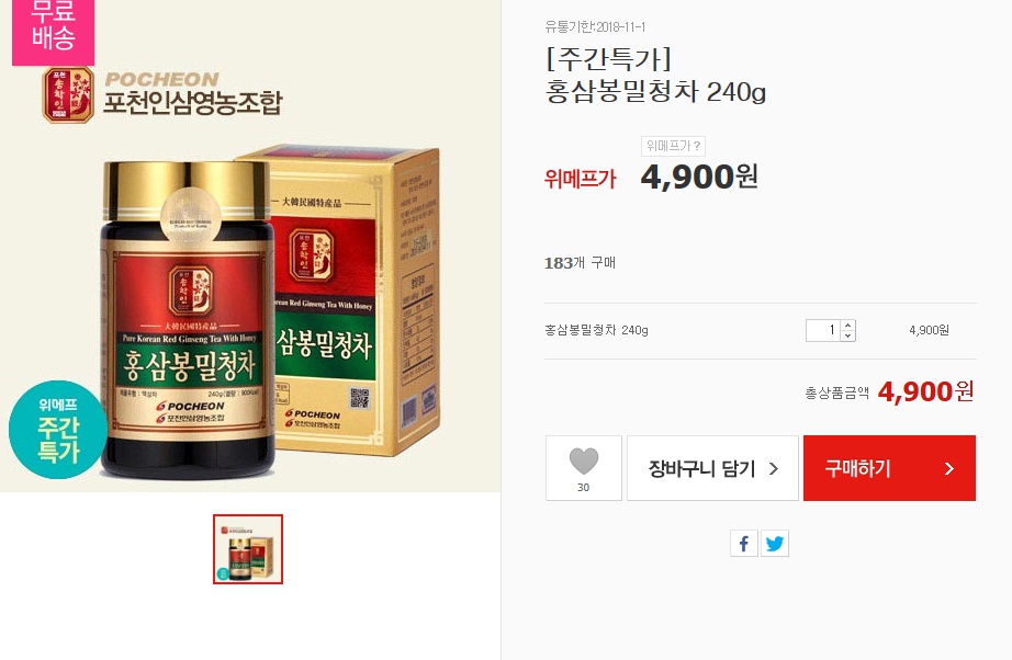 [위메프] 포천인삼영농조합 홍삼봉밀청차 240g (4,900원/무료) > 이건어때