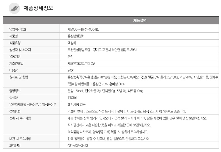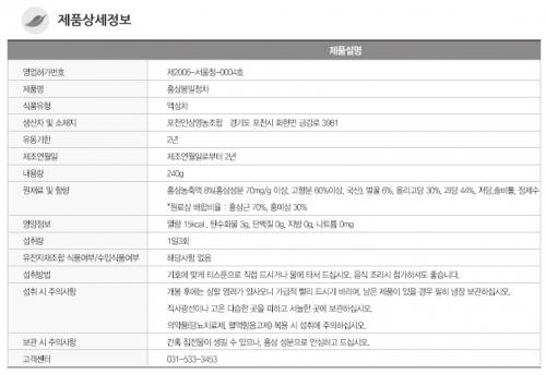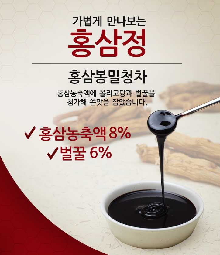 은 "홍삼농축액(홍삼성분70mg/g 이상 고형분 60%이상) 8%에 벌꿀 6%, 올리고당 30% 과당 44% 및 저당 및 솔