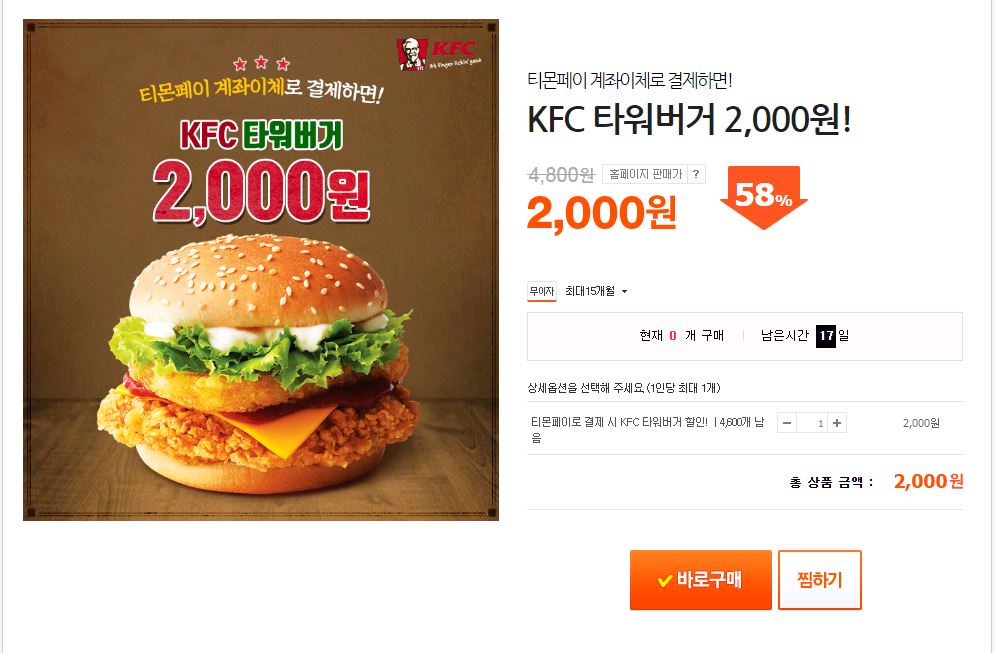 [티몬] KFC 타워버거 2,000원(티몬페이 결제시) (2,000원/무료)