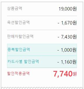 6900원에 추가 카드 할인 10% 가능할 것으로 보입니다.(할인 전 금액이 19천이기에 적용가능할 것이라 생각됩니다. 선착순 쿠폰이 마감되어 확인이 되진 않습니다. 안된다면 수정하겠습니다.)