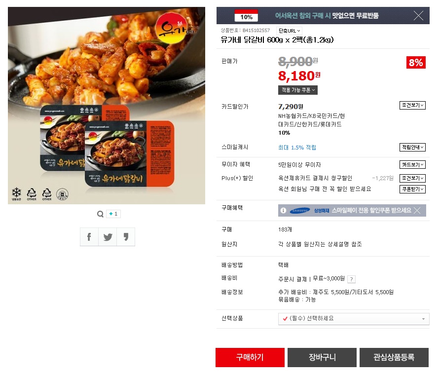 옥션에서 유가네 닭갈비 600g X 2팩 총 1.2kg 를 8180원에 팔고있습니다.