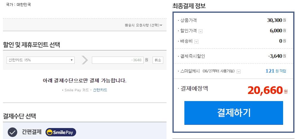 스마일페이 6천원 쿠폰 + 카드 즉시 할인 15% 적용시 최종 20,660원