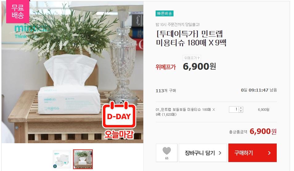 [위메프] 민트랩미용티슈 180매 X 9팩 (6,900원/무료) (~6.2) > 이건어때