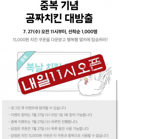 배달의민족 중복기념 공짜치킨 대방출을 하내요