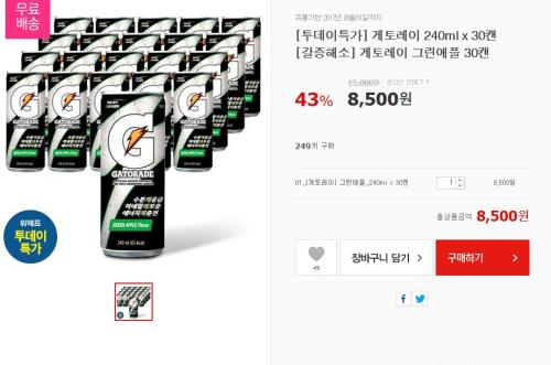 위메프에서 게토레이 그린애플 30캔을 8500원에 무료배송으로 팔고있습니다. 아쉬운점은 유통기한 임박상품이긴