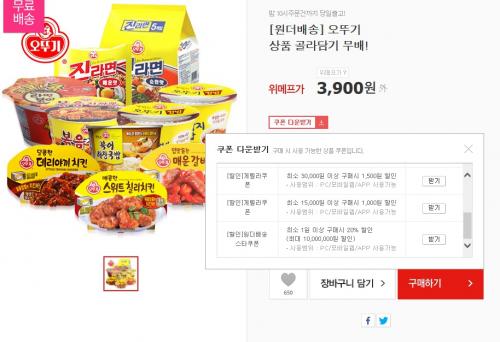 위메프에서 참깨라면 10봉을 6900원에 무료배송으로 팔고있습니다. 중요한건 원더배송 스타쿠폰이라고 해서 1원이