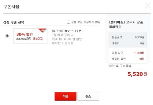상 20프로 할인쿠폰 다운이 가능하여 최종결제금액은 5520원이 되겠습니다. 쿠폰은 오늘까지 마감인걸로 보아 오