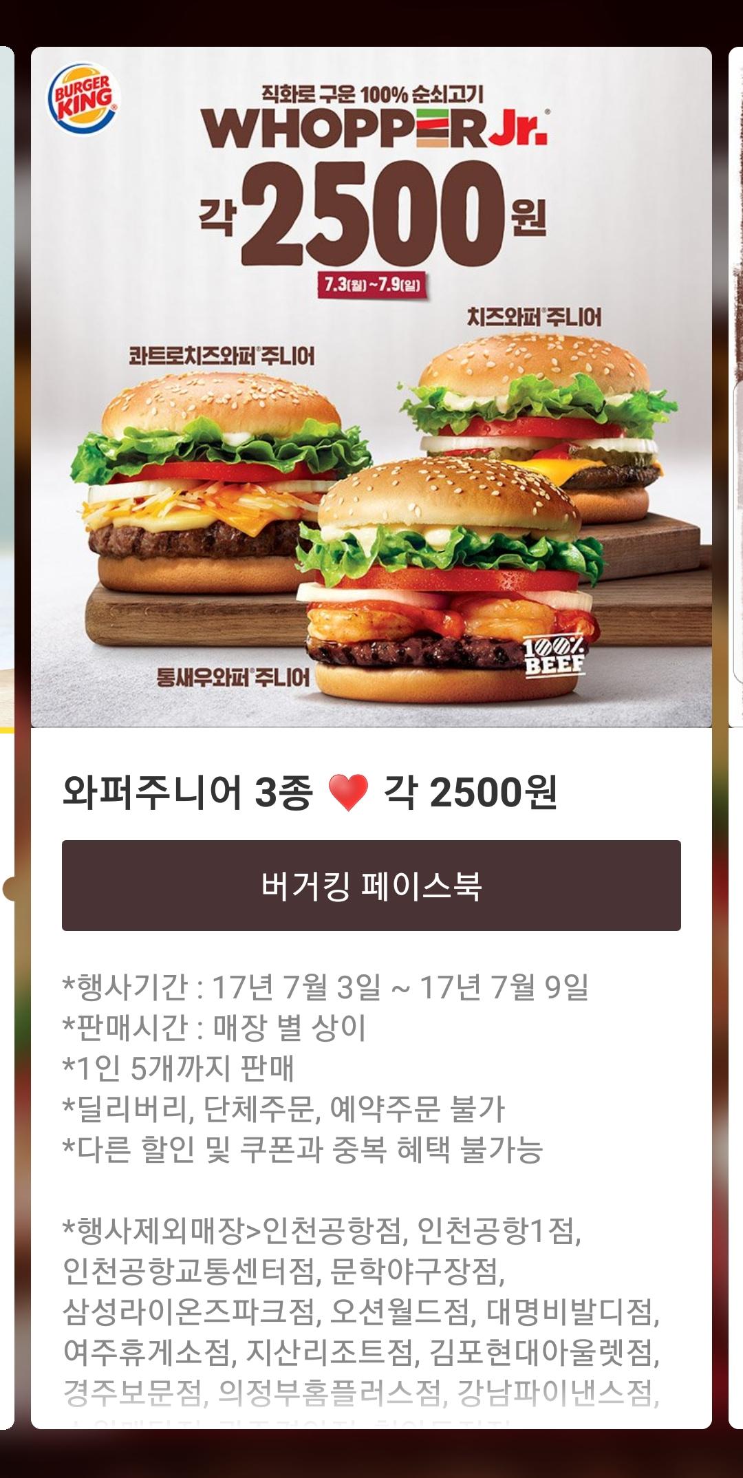 버거킹 와퍼 주니어 단품 2500원 행사합니다!