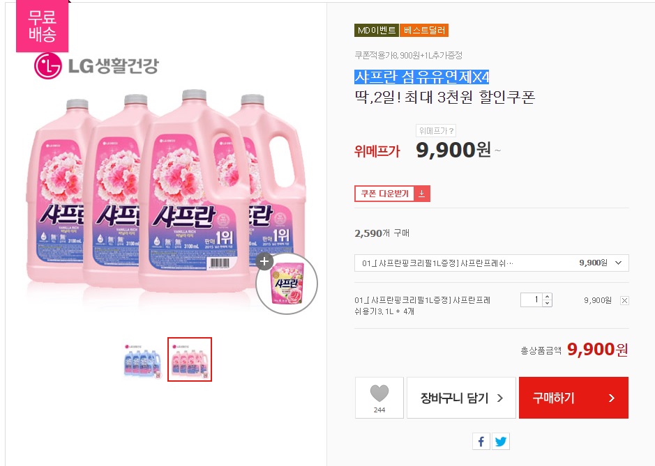 [위메프] 샤프란 섬유유연제 3.1L*4 + 1L*1개 (9,900/무료) 1세트 1천원 쿠폰, 2세트 3천원 쿠폰 적용가능 > 이건어때