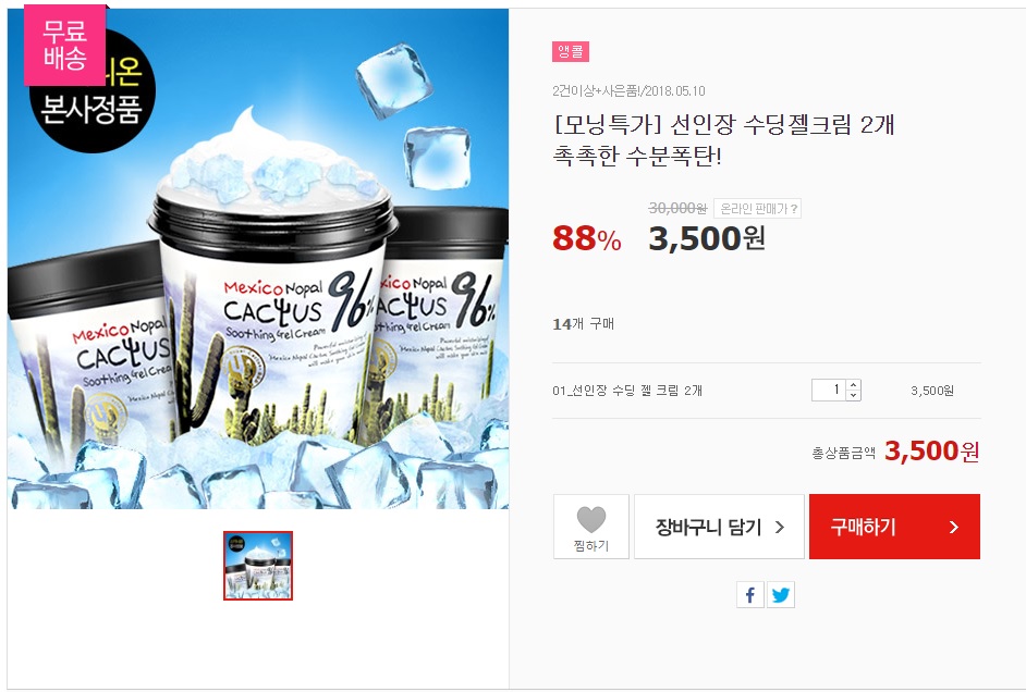 [위메프] 선인장 수딩젤크림 2개 (3,500/무료) (~7.4 10:00) > 이건어때