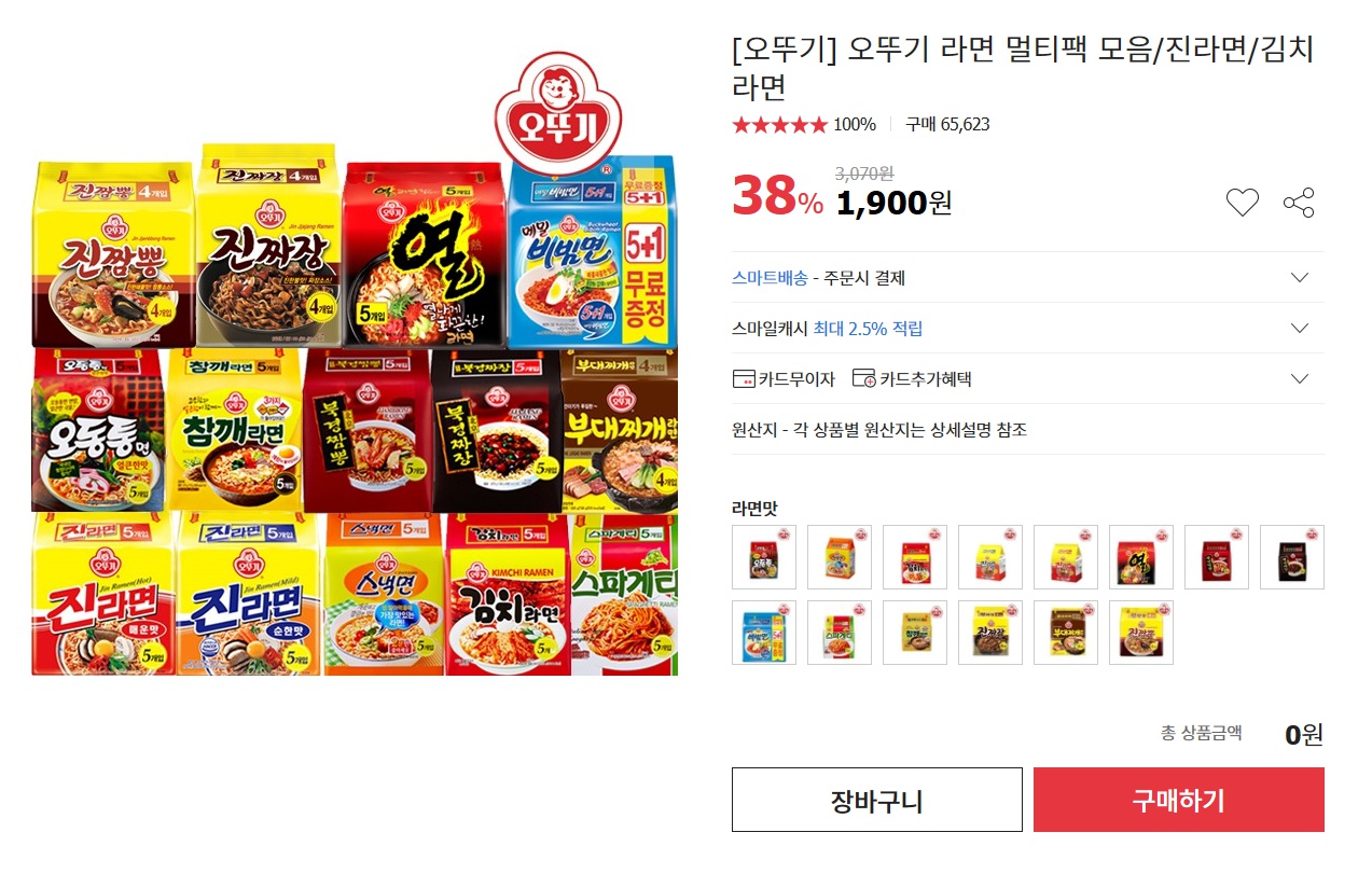 옥션에서 오뚜기 라면 멀티팩 모음을 1900원부터 배송비 3000원에 판매중입니다. 1900원라면은 열라면 까지 1900