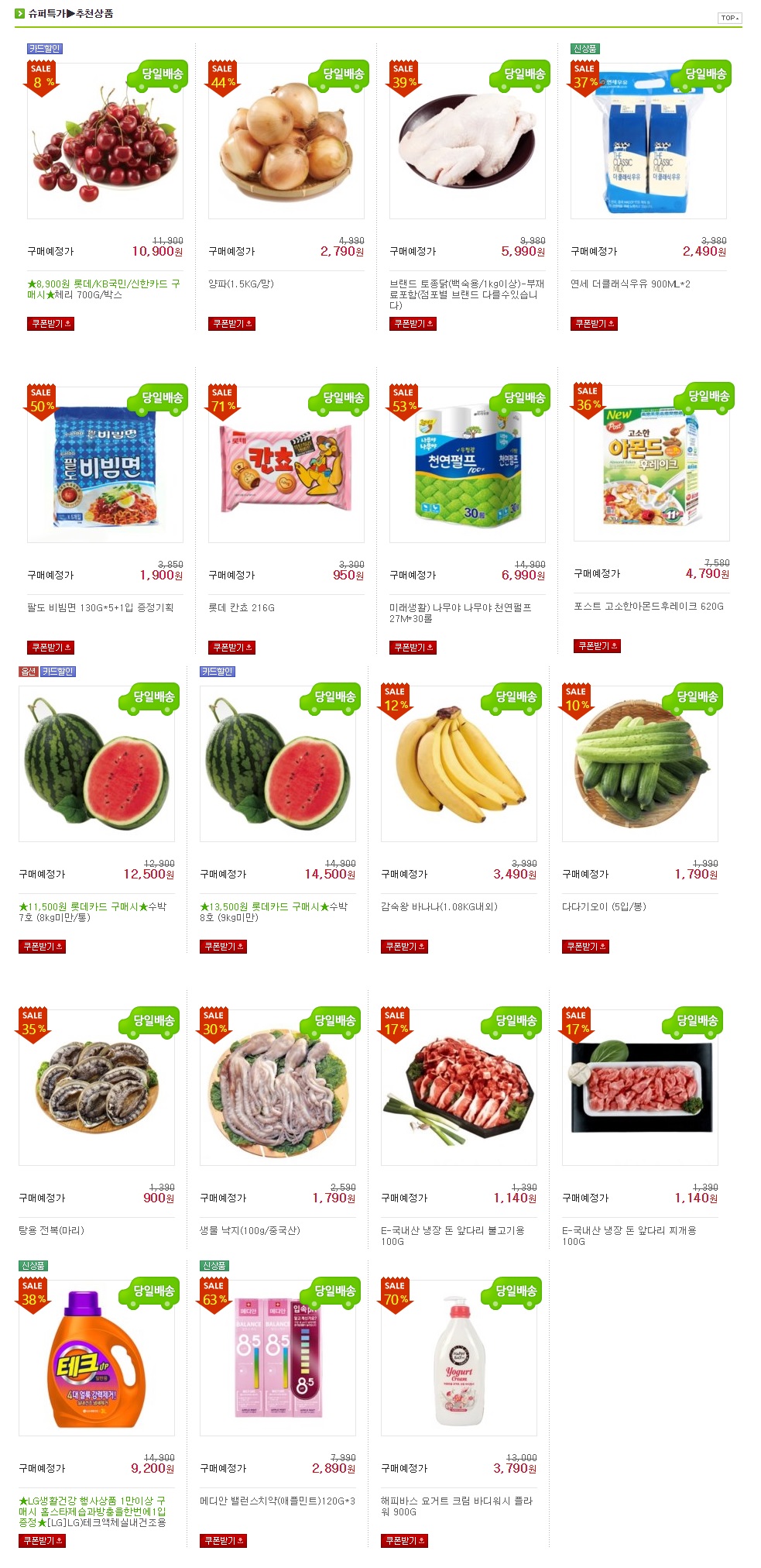 연세우유, 팔도비빔면, 아몬드후레이크,칸초, 감숙바나나, 바디샤워, 치약 등이 저렴해보입니다.