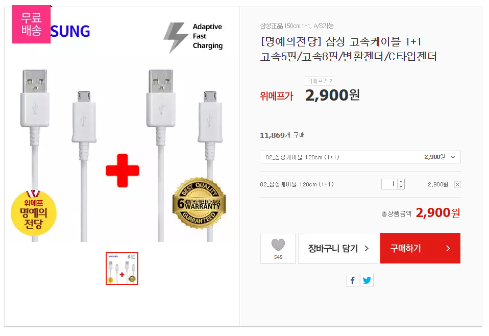[위메프] [명예의전당] 삼성 고속케이블 1+1고속5핀/고속8핀/변환젠더/C타입젠더 (2,900원/무료)