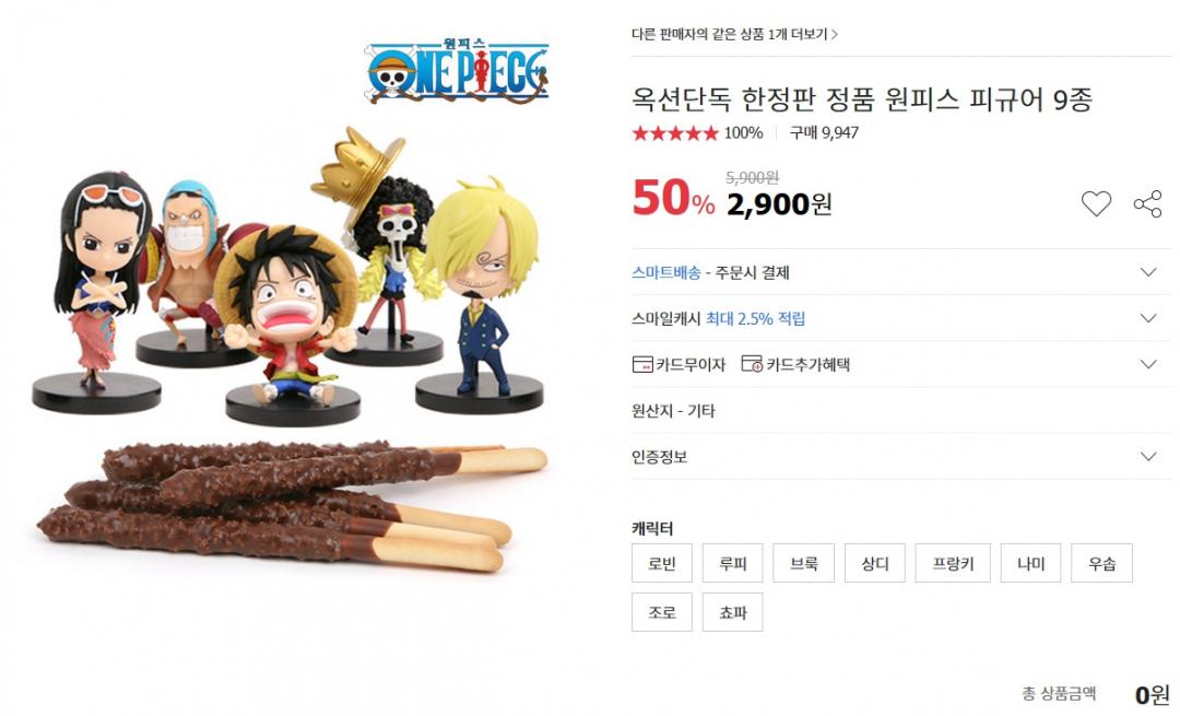 옥션에서 한정판 원피스 피규어 9종 + 크런키 초코스틱을 2900원에 유료배송으로 팔고있습니다. 정품 피규어라는