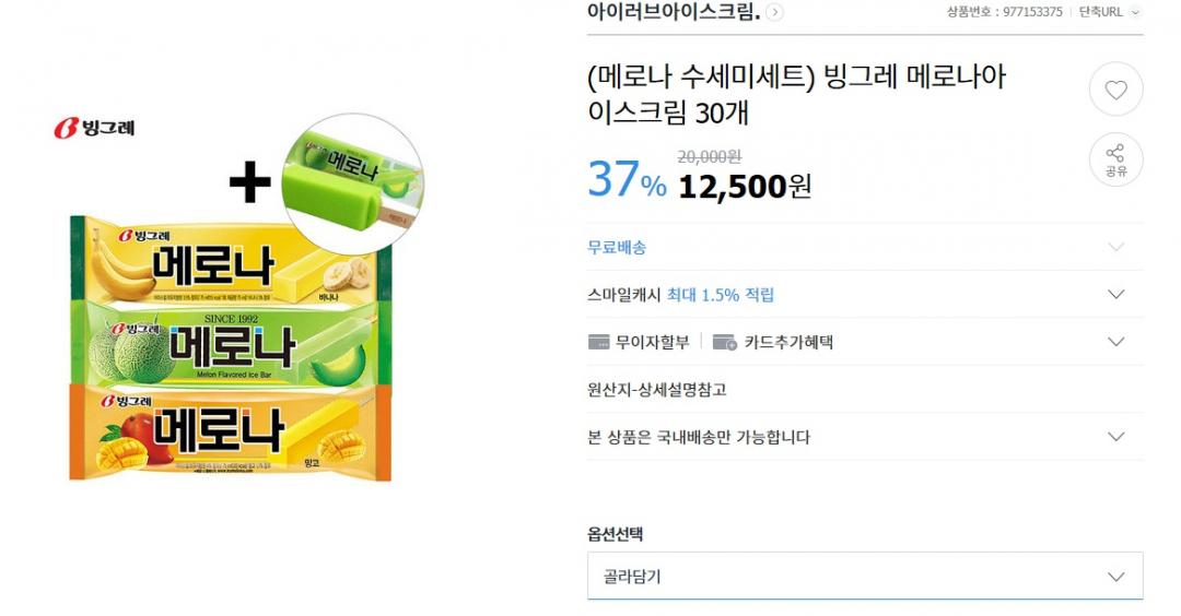 지마켓에서 메로나 30개 + 메로나 수세미구성으로 12500원에 무료배송으로 팔고있습니다. 한가지맛만 30개도 가능