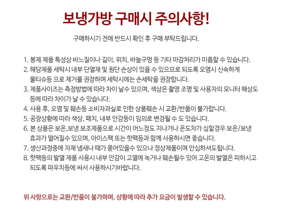 보온/보냉이 된다고 합니다. 주의사항은 위에 사진을 참고바라며 01번 02번 가방이 3200원이며 나머지 가방들은