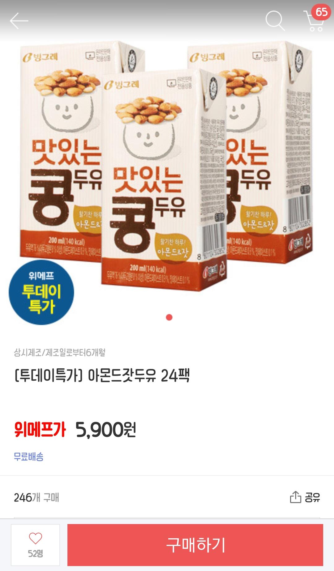 [위메프] 빙그레 아몬드잣두유 24팩 (5,900원/무료) > 이건어때