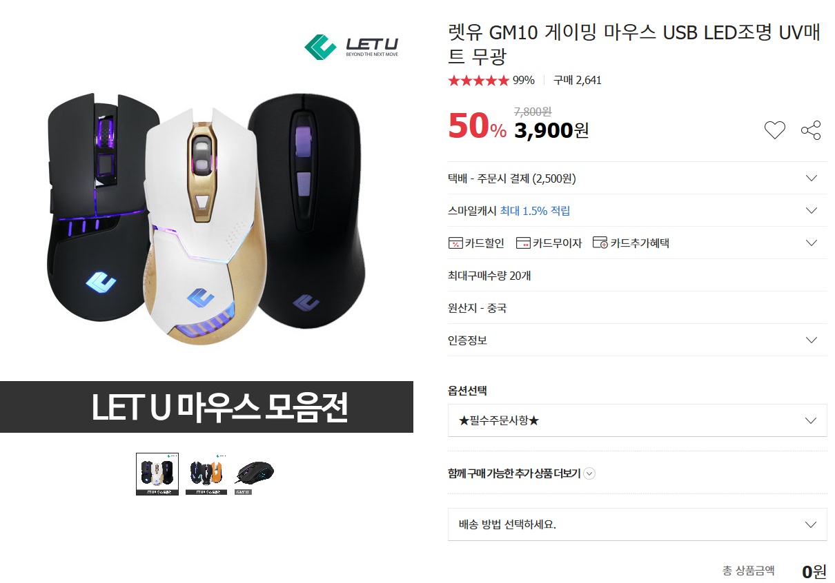 옥션에서 렛유 게이밍 마우스를 3900원에 유료배송으로 팔고있습니다. 저도 예전에 6900원인가 싸다고 한두개 예