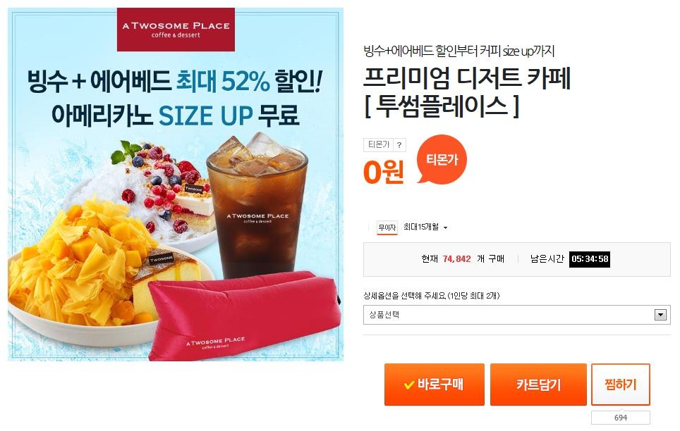 티몬에서 투썸플레이스 아메리카노 SIZE UP 쿠폰을 무료로 드리고 있습니다. 추가로 빙수 + 에어버드 52프로 할인