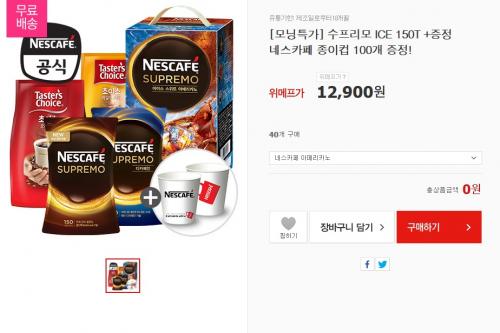 위메프에서 모닝특가로 네스카페 수프리모 ICE 150T + 종이컵 100개 세트를 12900원에 무료배송으로 팔고있습