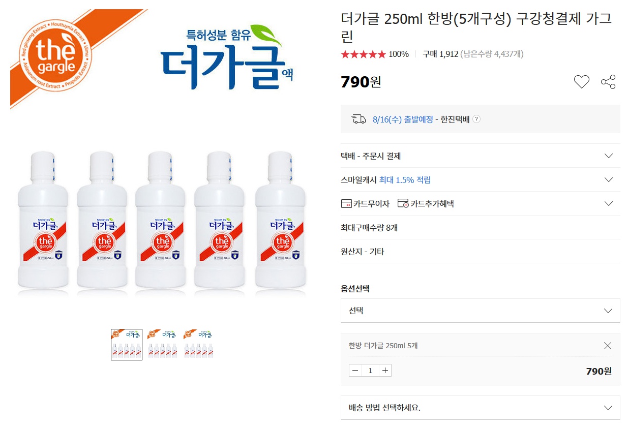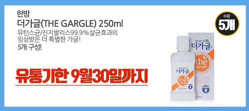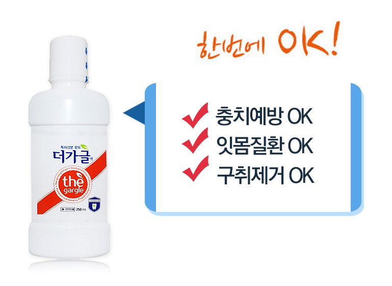 옥션에서 구강청결제 더가글 250ML X 5EA를 750원에 팔고있습니다. 충치예방 잇몸질환 구취제거를 해준다고 합
