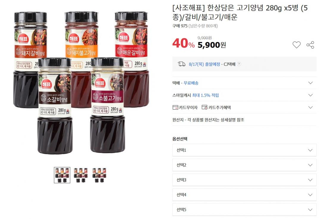 옥션에서 해표 고기양념 5종 280G X 5병을 5900원에 무료배송으로 팔고있습니다. 가격으로 보면 엄청싼거 같습니