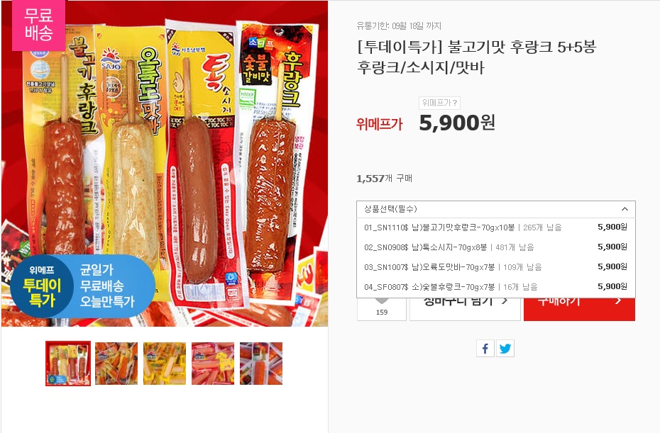 위메프 투데특가로 사조 후랑크 & 맛바 10봉을 5900원에 무료배송으로 팔고있습니다. 불고기 후랑크만 10봉입니다