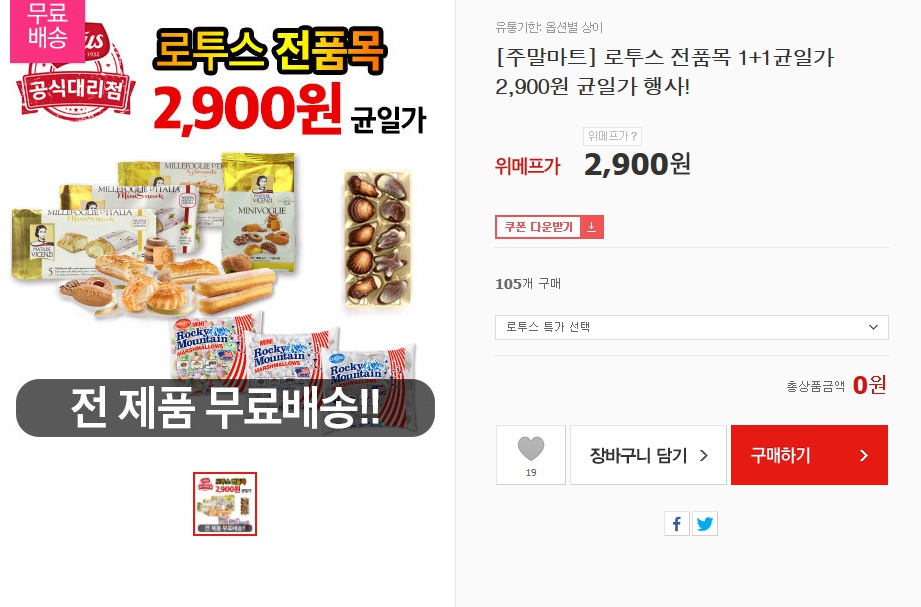 위메프에서 로투스 전품목 1 + 1을 2900원에 무료배송으로 팔고있습니다. 전품목 모두 2900원이며 유통기한 임박