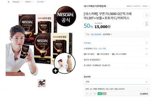 지마켓에서 네스카페 크레마 130T + 앤틱보틀 + 박보검카드 8장을 15000원에 무료배송으로 팔고있습니다. 추가로