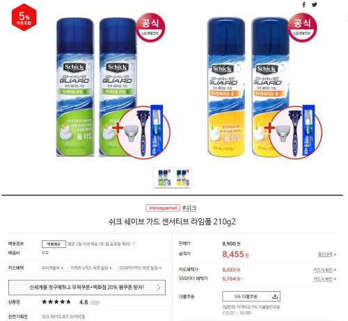 SSG닷컴에서 쉬크 쉐이브 가드 2종 210G X 2개 + 사은품 3종으로 8033원에 무료배송으로 팔고있습니다. 쉐이빙폼