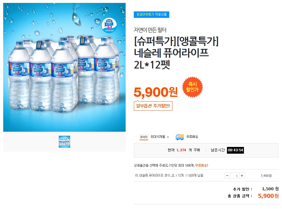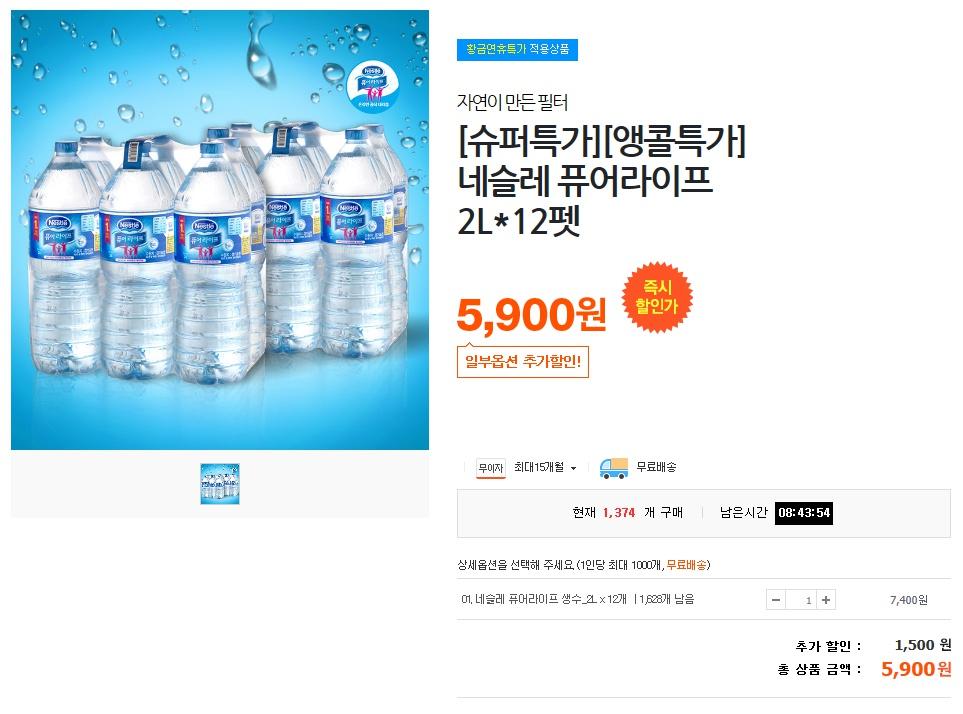 티몬에서 네슬레 퓨어라이프 2L X12펫을 5900원에 무료배송으로 팔고있습니다. 추가로 티몬 1000원 적립금 사용