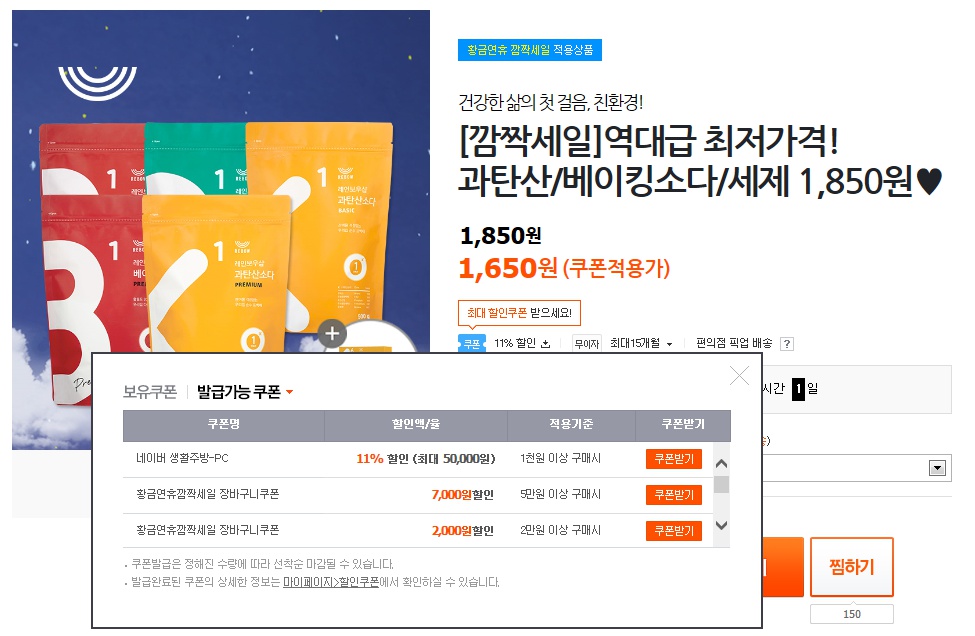 [티몬] 레인보우샵 과탄산/베이킹소다 세제 (1.850원/2,500원)