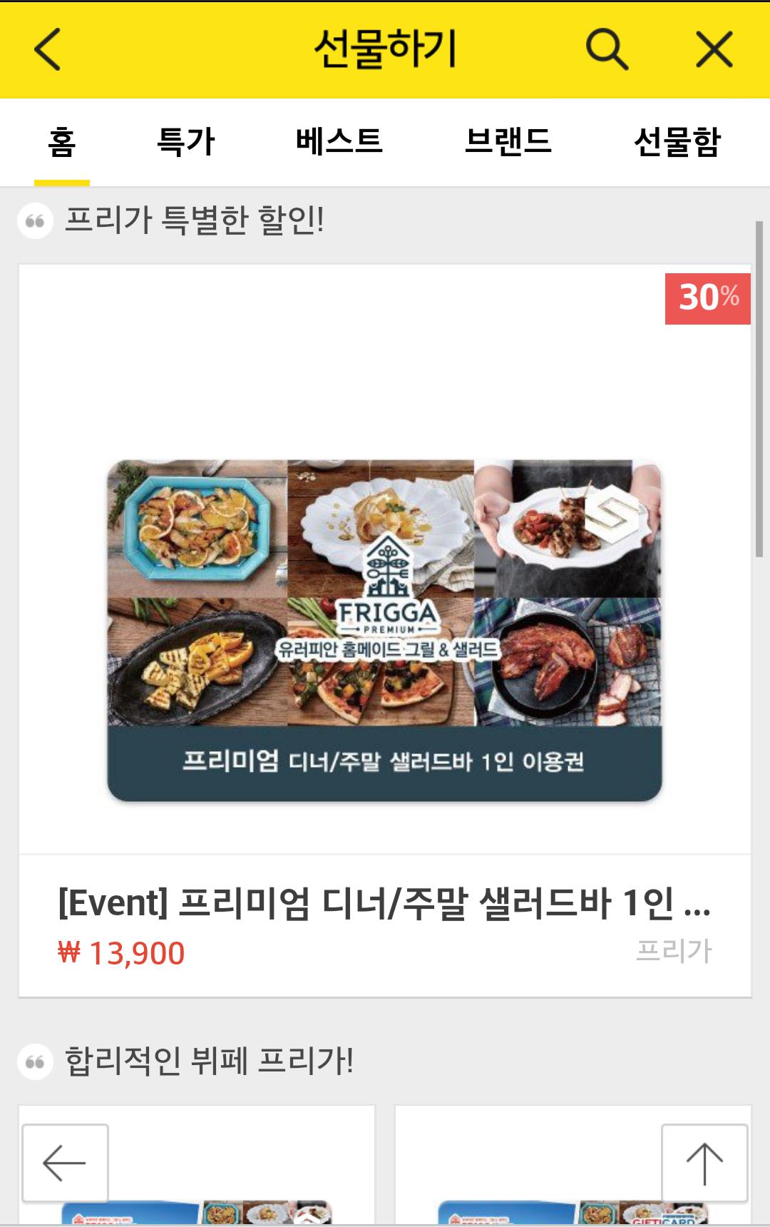 [카카오톡선물하기] 프리가 프리미엄 디너/주말 샐러드바 1인 이용권 (13,900/0) > 이건어때