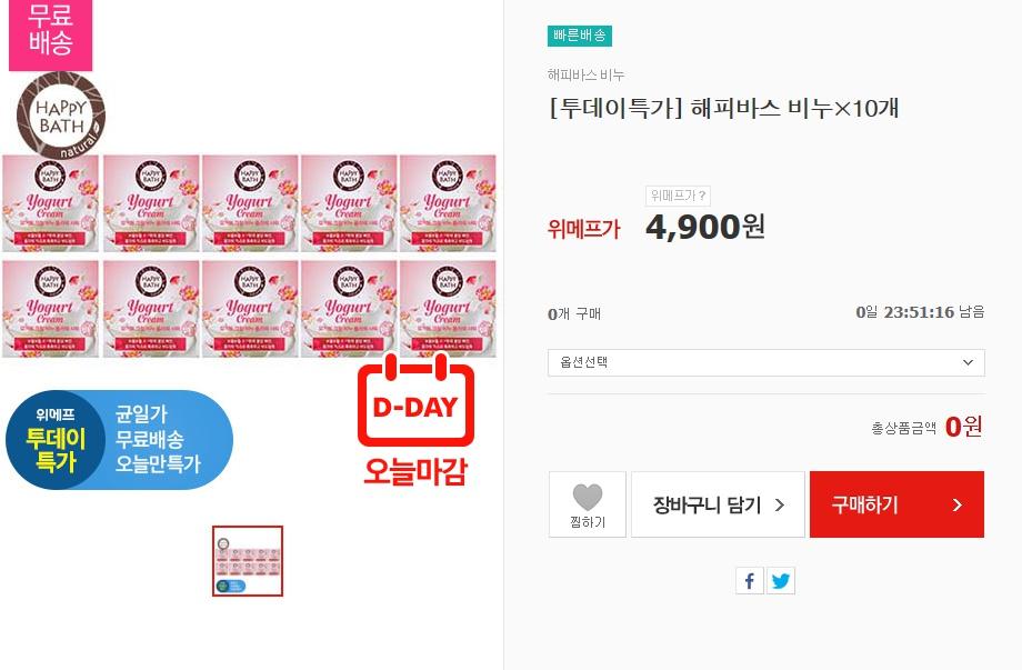 위메프에서 해피바스 비누 10개를 4900원에 무료배송으로 팔고있습니다. 믹스베리/플라워샤워 2종류 있으며 필요