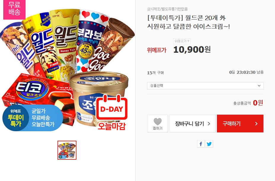 위메프에서 월드콘 치즈/허니유자 X 20개를 10900원에 무료배송으로 팔고있습니다. 필요하신분은 바로 구매하심