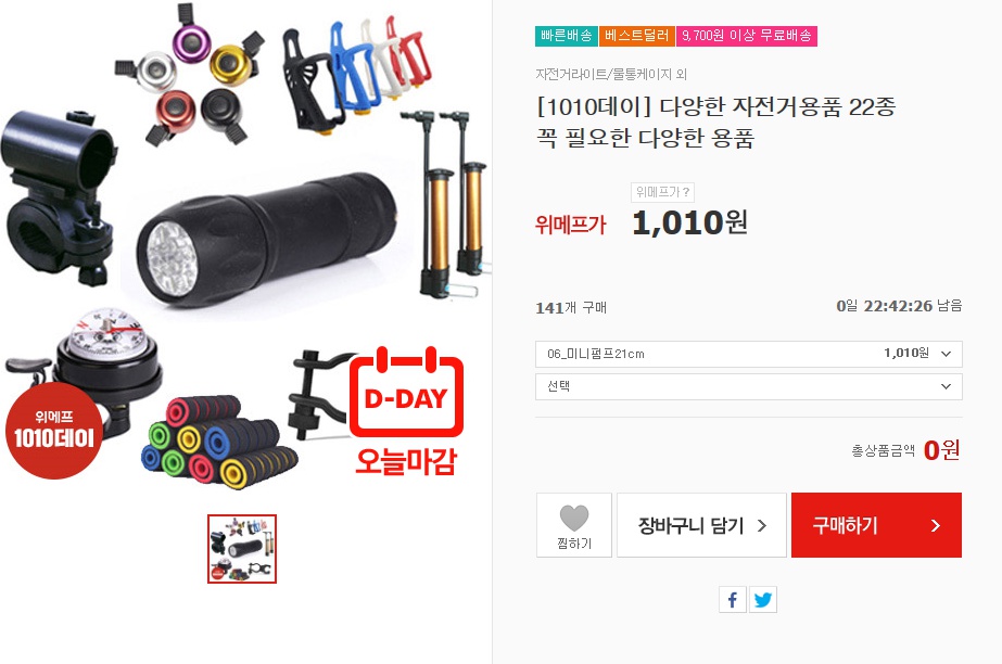 위메프에서 자전거용품 22종을 1010원에 유료배송으로 팔고있습니다. 미니펌프부터 타이어 펑크패치 물통게이지