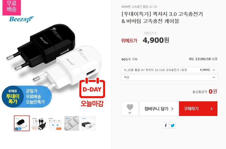 위메프에서 비잽 퀵차지 3.0 충전기를 4900원에 무료배송으로 팔고있습니다. 5천원대 미만 가격이면 퀵차지 2.0의