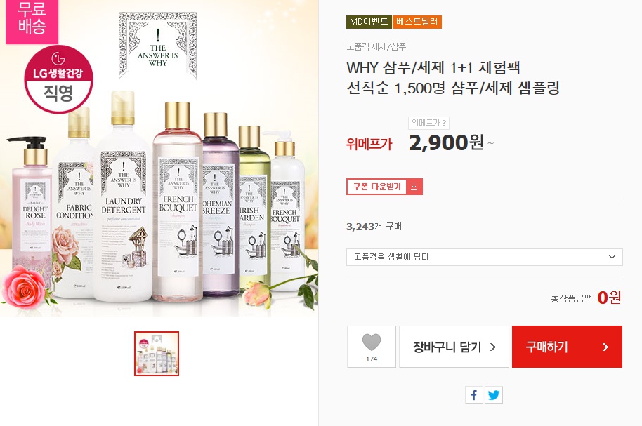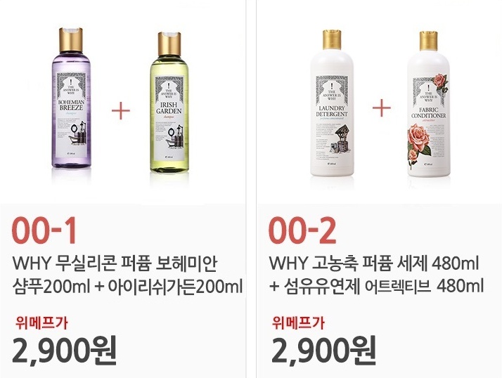 위메프에서 LG생활건강 WHY 체험팩을 2900원에 무료배송으로 팔고있습니다. 구성은 샴푸+아이리쉬가든 or 세제+