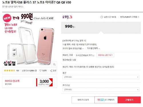 11번가에서 스마트폰 젤리케이스를 990원에 무료배송으로 팔고있습니다. 최신 스마트폰 기종인 V30,노트8도 있다