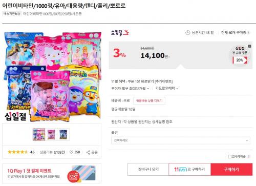 11번가에서 어린이비타민 콩순이or또봇 1000정 + 사은품을 15300원에 무료배송으로 팔고있습니다. 유통기한은 19