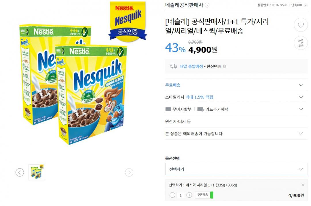 지마켓에서 네슬레 네스퀵 시리얼 1+1을 4900원에 무료배송으로 팔고있습니다. 무료배송에 엄청 저렴한가격이며