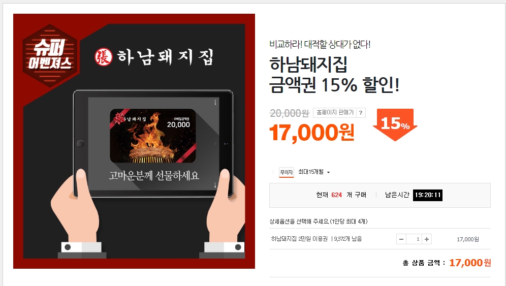 [티몬] 하남돼지집 금액권 (17,000/무료) > 이건어때