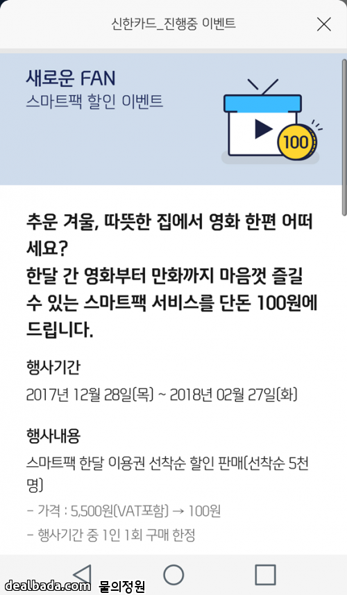 신한FAN 어플 리뉴얼 기념으로 스마트팩 한달 이용권을 100원에 결제할 수 있는 이벤트를 하나 봐요.