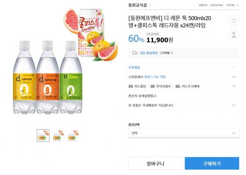 지마켓에서 동원 디 레몬 톡 500ML X 20병 + 쿨피스톡 레드자몽 X 24캔을 11900원에 무료배송으로 팔고있습니다.