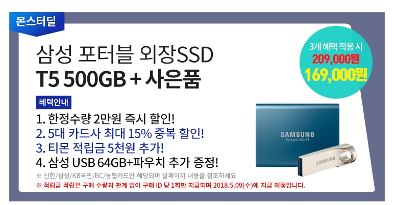 [티몬] 삼성 포터블 SSD T5 500GB + USB 64GB (189,000원/무료)/모든혜택 적용시 169,000원 구매가능 > 이건어때