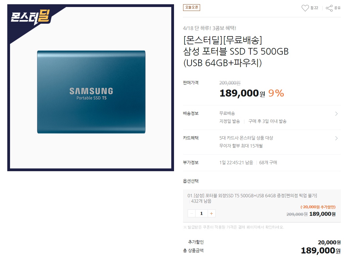 티몬에서 삼성 포터블 SSD T5 500GB + USB 64GB를 189000원에 무료배송으로 팔고있습니다. 추가로 위에 사진에