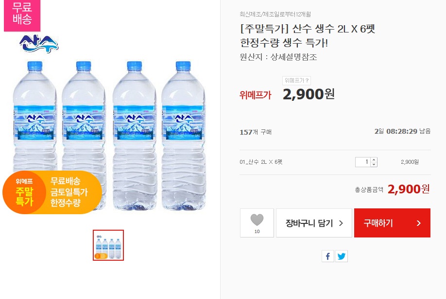위메프에서 산수 생수 2L X 6펫을 2900원에 무료배송으로 팔고있습니다. 생수 필요하신분은 바로 구매하시면 좋을